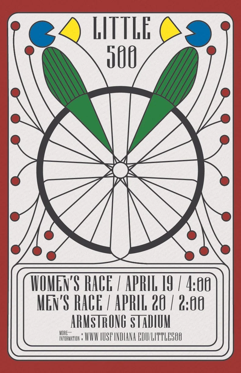 This project asked me to create a poster for Indiana University’s “Little 500” annual bike race, emulating the style of a particular designer. I chose Charles Rennie Mackintosh, a Scottish designer who was part of the Art Deco and Arts and Crafts movements of the early 1900s.